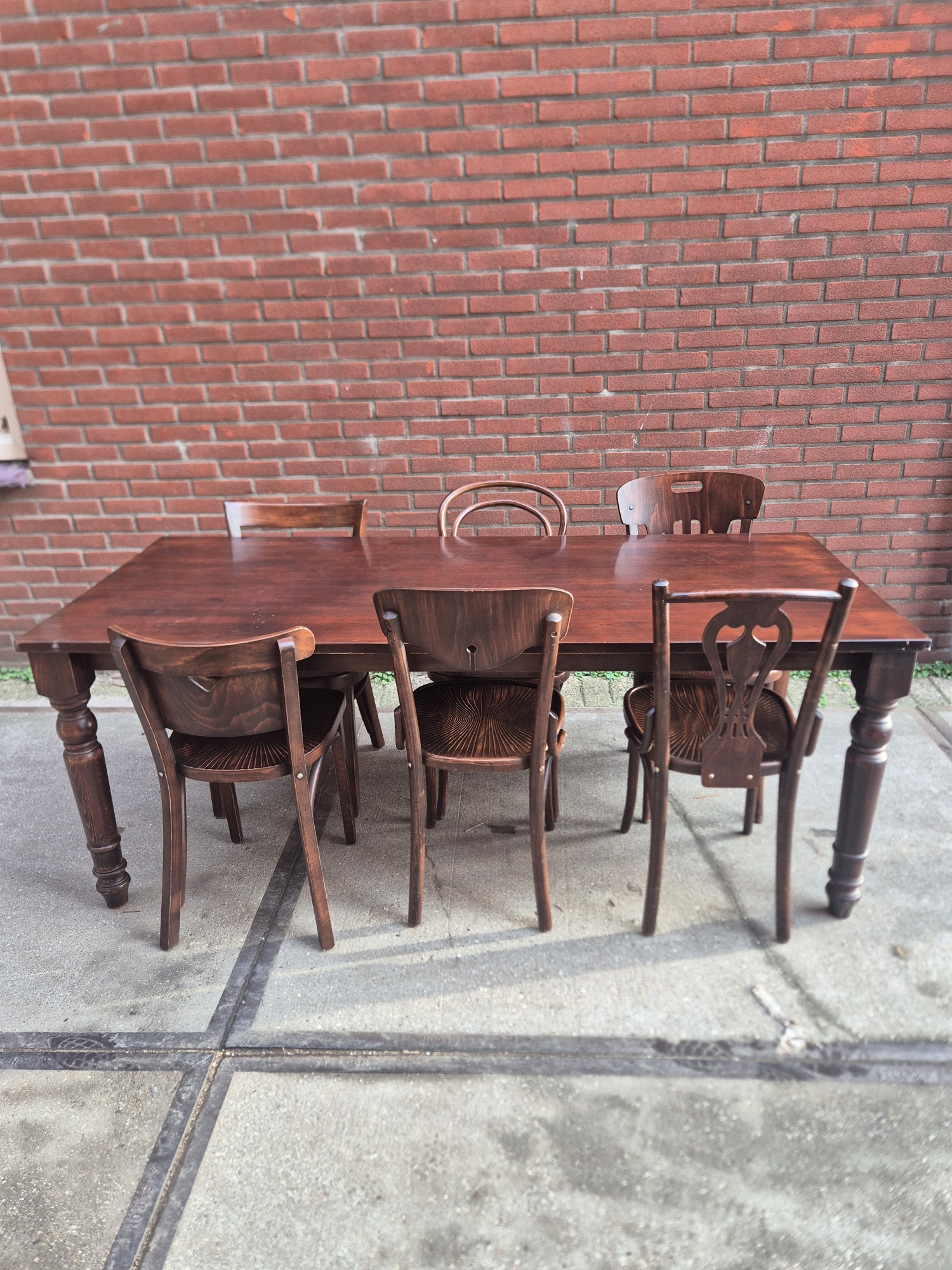 Houten tafel 190x80cm met oud hollands gedraaide poten en 6 houten stoelen