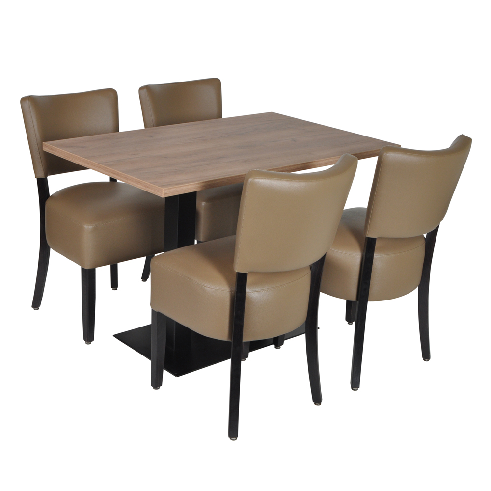 | Inhoud set | 4 x lisa stoel taupe kunstleder, 1 x Flat premium onderstel rechthoek, 1 x melamine houtdecor tafelblad 110x70cm |