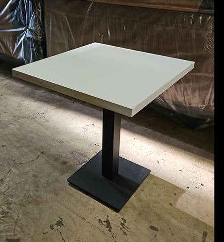 Wit melamine tafelblad 70×70, 40mm dik met nieuwe tafelonderstel gietijzer. Minimale afname 5 stuks.