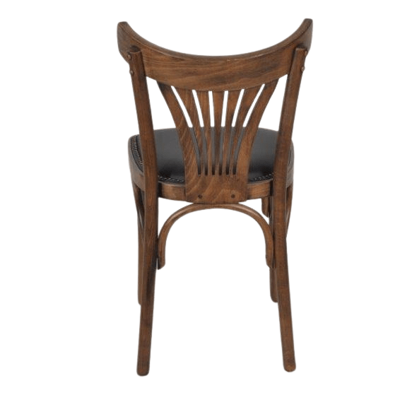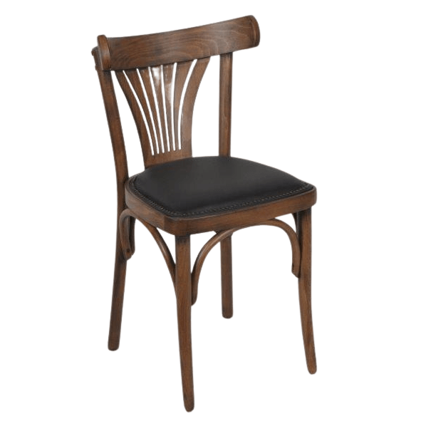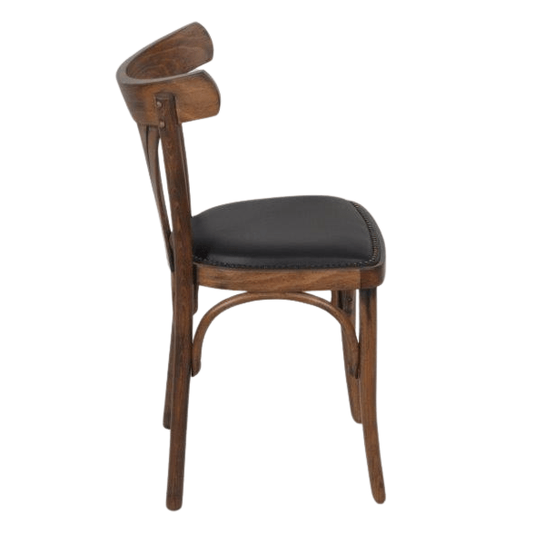 Sterke kwaliteit caféstoel met een antiek gebeitste finish hout. De zitting is bekleed met een hoge kwaliteit kunstleder en sierlijk afgezet met nagels.