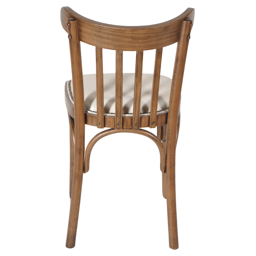 Sterke kwaliteit caféstoel met een antiek gebeitste finish hout. De zitting is bekleed met een hoge kwaliteit stof, vlekvrij middels Fibreguard, en sierlijk afgezet met nagels.