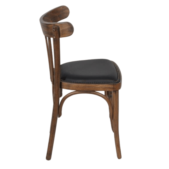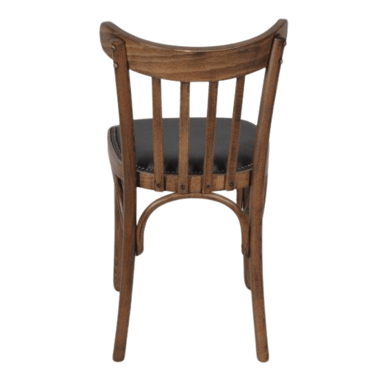 Sterke kwaliteit caféstoel met een antiek gebeitste finish hout. De zitting is bekleed met een hoge kwaliteit kunstleder en sierlijk afgezet met nagels.