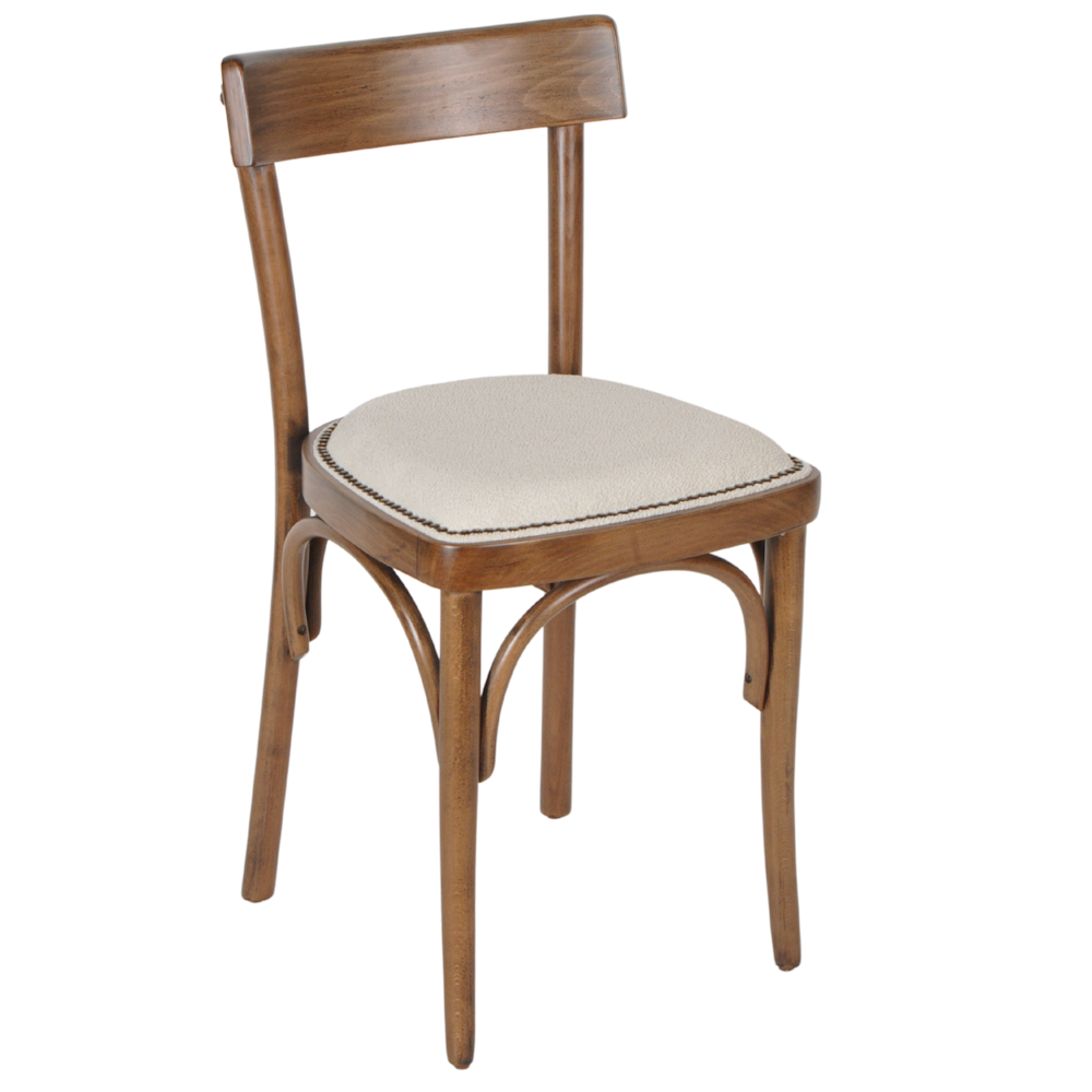 Sterke kwaliteit caféstoel met een antiek gebeitste finish hout. De zitting is bekleed met een hoge kwaliteit stof, vlekvrij middels Fibreguard, en sierlijk afgezet met nagels.