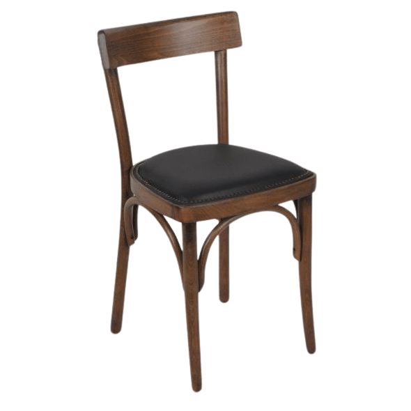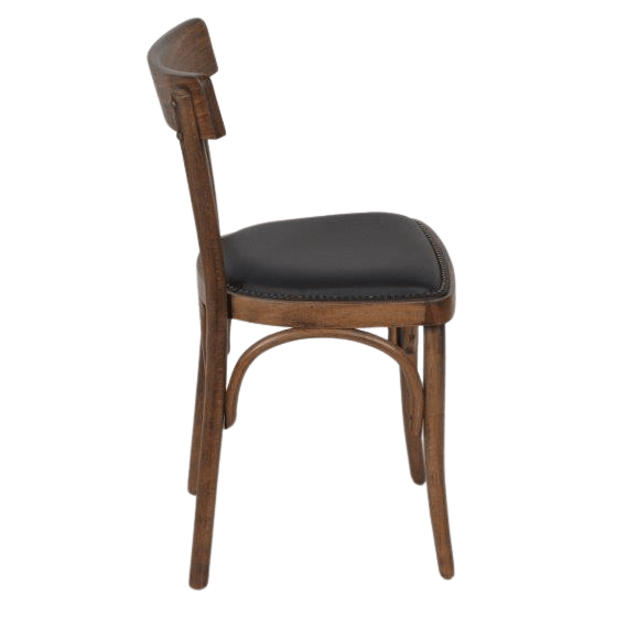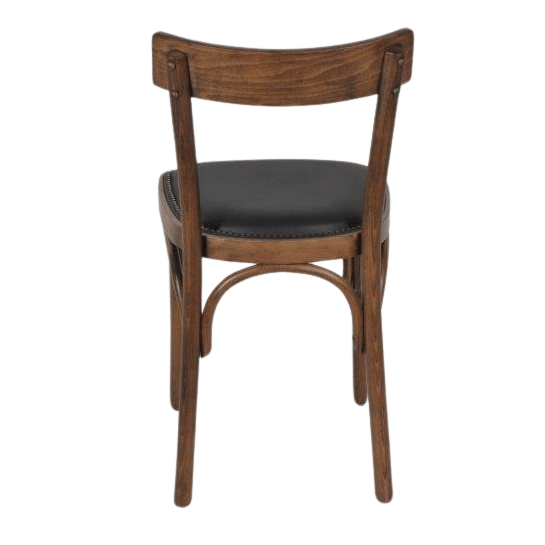 Sterke kwaliteit caféstoel met een antiek gebeitste finish hout. De zitting is bekleed met een hoge kwaliteit kunstleder en sierlijk afgezet met nagels.