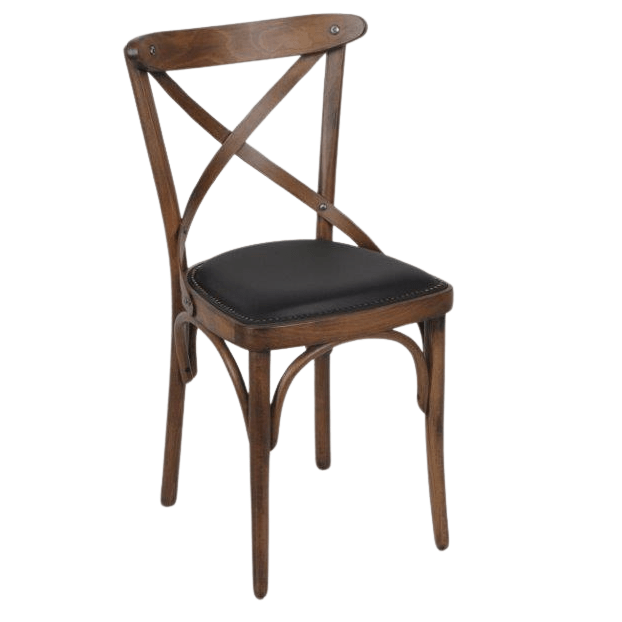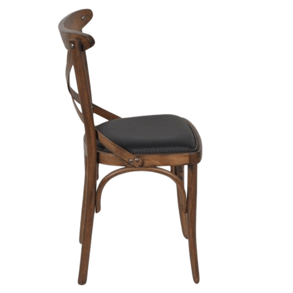 Sterke kwaliteit caféstoel met een antiek gebeitste finish hout. De zitting is bekleed met een hoge kwaliteit kunstleder en sierlijk afgezet met nagels.